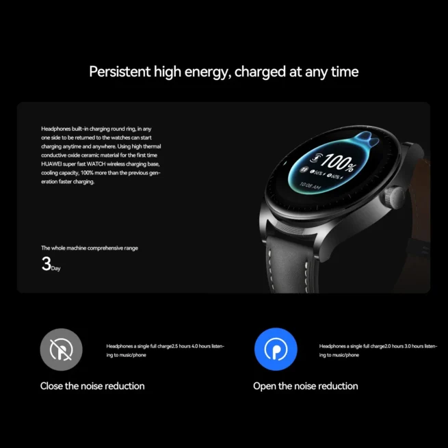 The overall battery life of the whole machine is 3 days, and the earphones can last for a single full charge; turn off noise reduction: listen to music for 4.0 hours/talk for 2.5 hours; turn on noise reduction: listen to music for 3.0 hours/talk for 2.0 hours;
