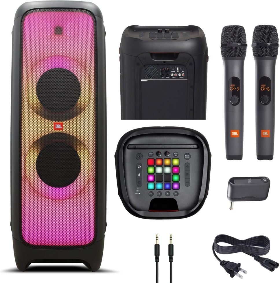 • Qué incluye: 1 altavoz Bluetooth inalámbrico JBL PartyBox 1000 de alta potencia de 1100 W, 1 sistema de micrófono dual inalámbrico JBL (con receptor de doble canal), 1 cable auxiliar, 1 paño de microfibra, auriculares deportivos internos inalámbricos + 2 micrófonos